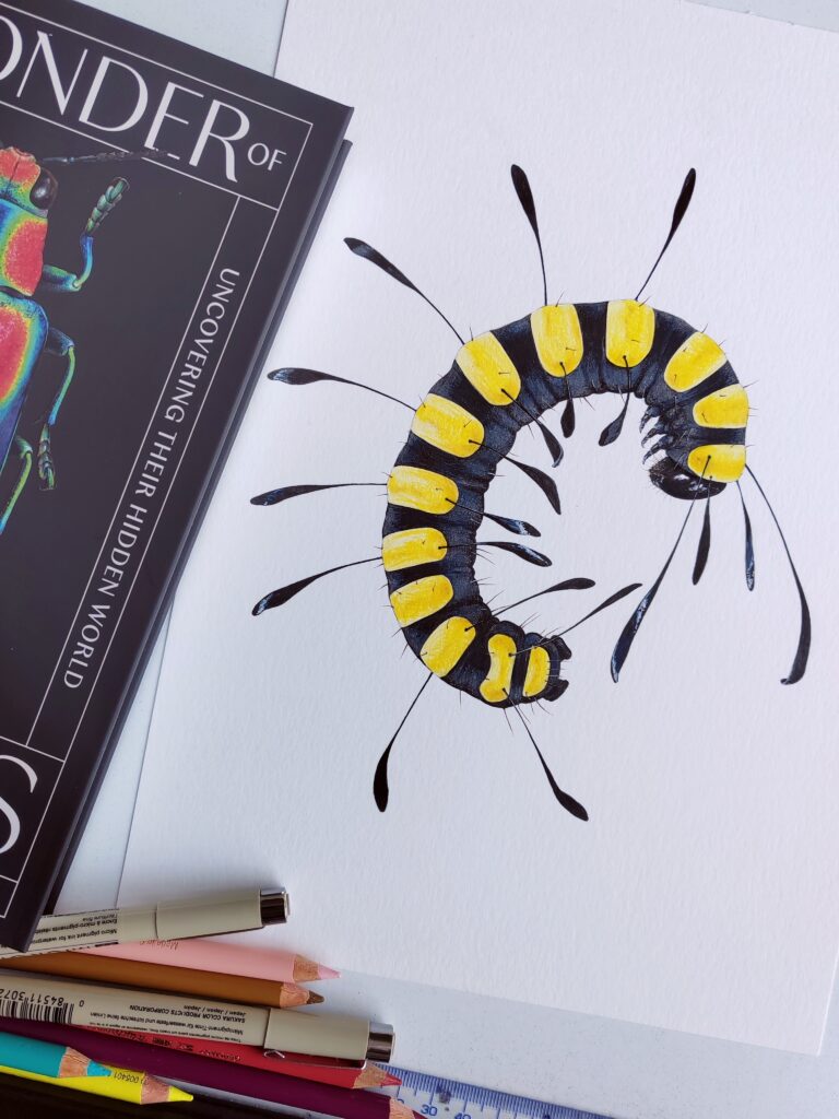 Today’s excerpt from my NEW BOOK is the Alder Moth, specifically the caterpillars of this species. This is one of my favourite illustrations by Carim Nahaboo.